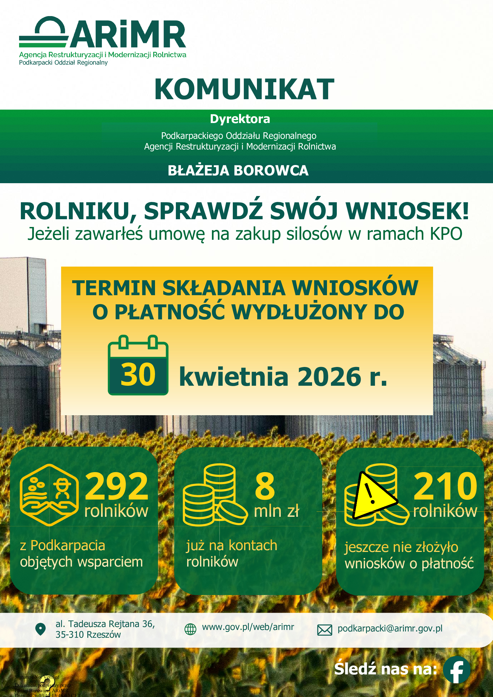 W związku z działaniami informacyjnymi dotyczącymi wsparcia dla rolników w ramach 𝐊𝐫𝐚𝐣𝐨𝐰𝐞𝐠𝐨 𝐏𝐥𝐚𝐧𝐮 𝐎𝐝𝐛𝐮𝐝𝐨𝐰𝐲 𝐢 𝐙𝐰𝐢ę𝐤𝐬𝐳𝐚𝐧𝐢𝐚 𝐎𝐝𝐩𝐨𝐫𝐧𝐨ś𝐜𝐢 (KPO), Dyrektor POR ARiMR informuje, że termin realizacji przedsięwzięć oraz termin złożenia wniosków o płatność został wydłużony z dnia 28 lutego 2026 r. 𝐝𝐨 𝐝𝐧𝐢𝐚 𝟑𝟎 𝐤𝐰𝐢𝐞𝐭𝐧𝐢𝐚 𝟐𝟎𝟐𝟔 𝐫.