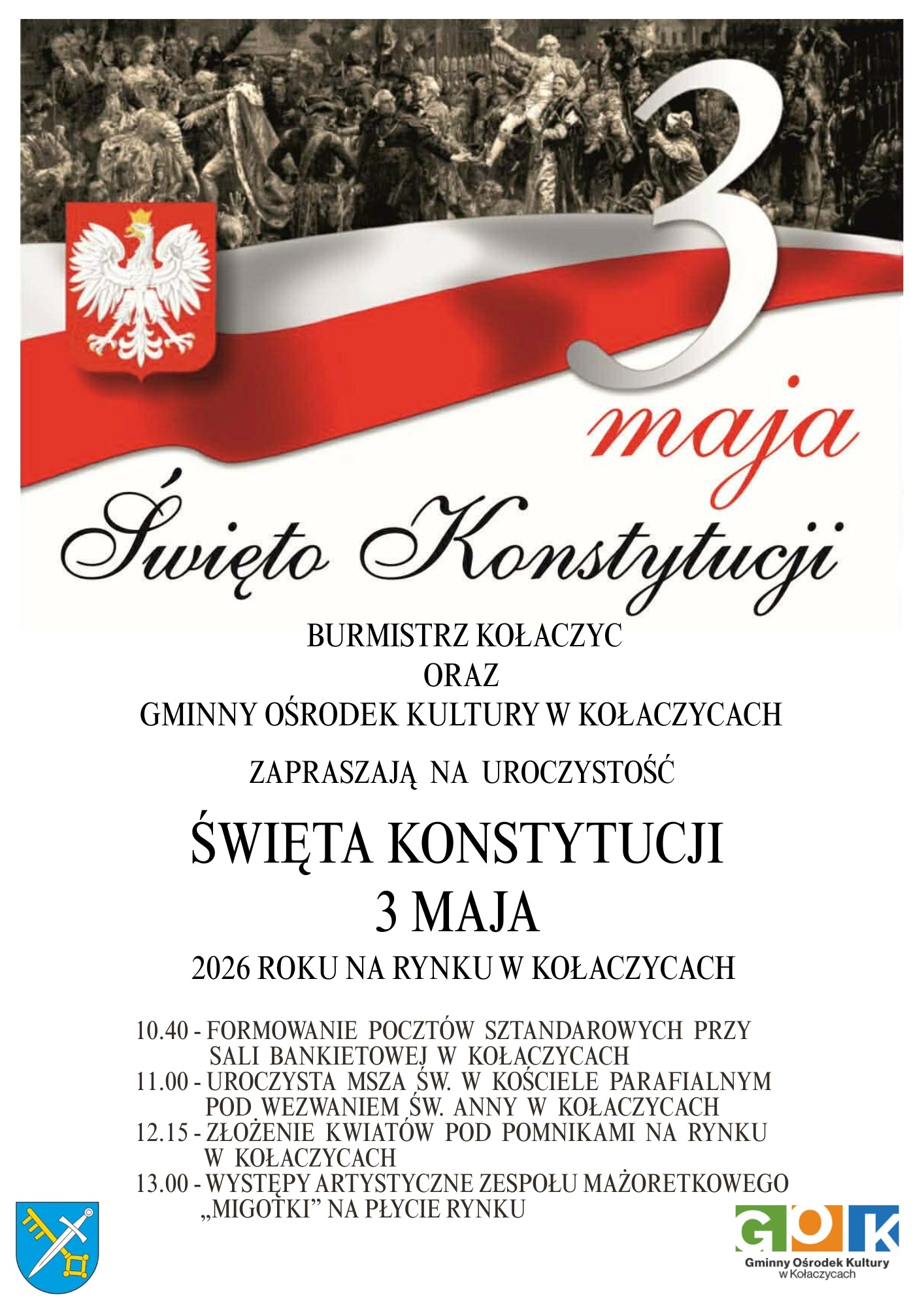 Burmistrz Kołaczyc oraz Gminny Ośrodek Kultury w Kołaczycach serdecznie zapraszają do wspólnego świętowania 𝟐𝟑𝟓. 𝐫𝐨𝐜𝐳𝐧𝐢𝐜𝐲 𝐮𝐜𝐡𝐰𝐚𝐥𝐞𝐧𝐢𝐚 𝐊𝐨𝐧𝐬𝐭𝐲𝐭𝐮𝐜𝐣𝐢 𝟑 𝐌𝐚𝐣𝐚.