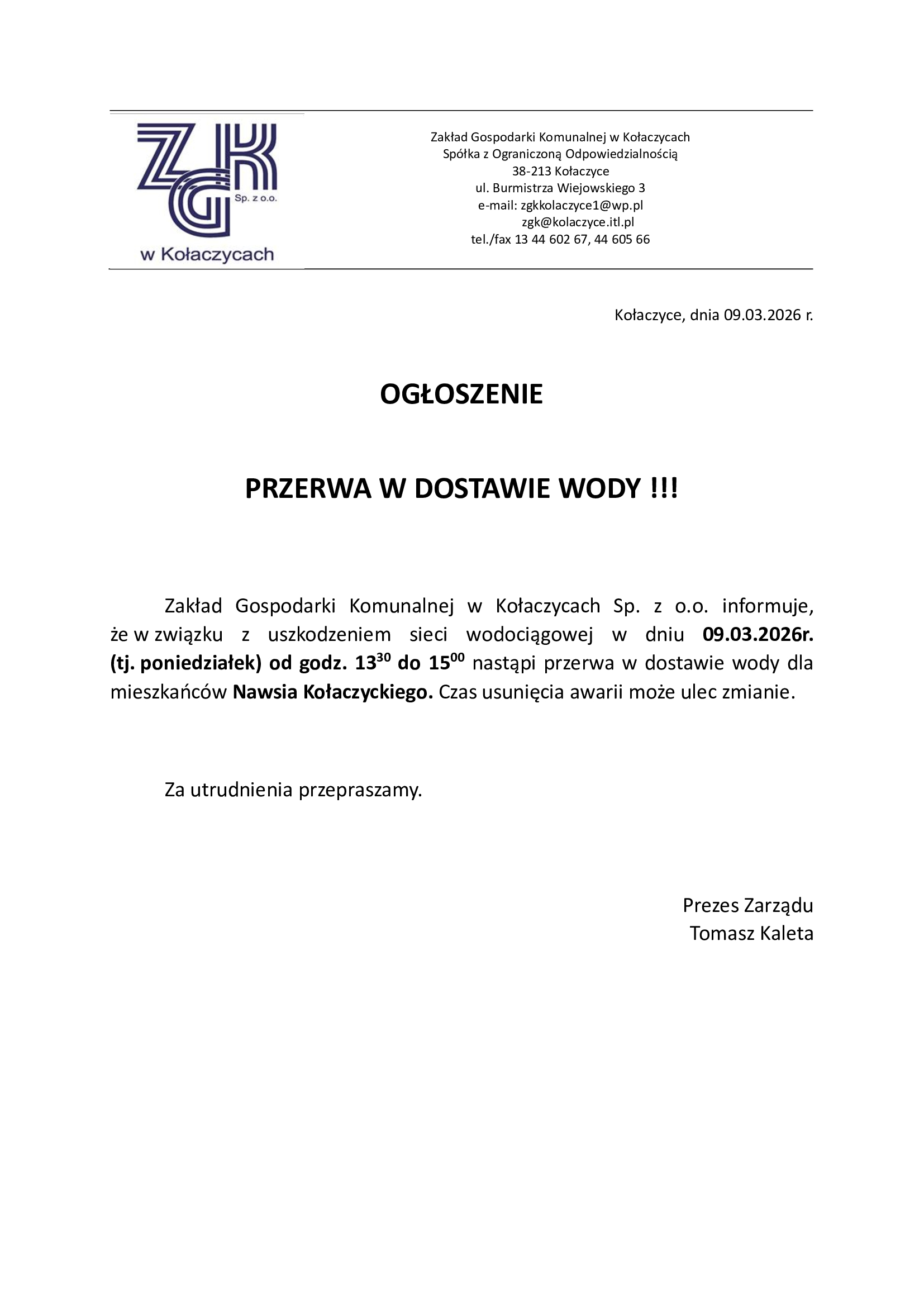 Przerwa w dostawie wody!