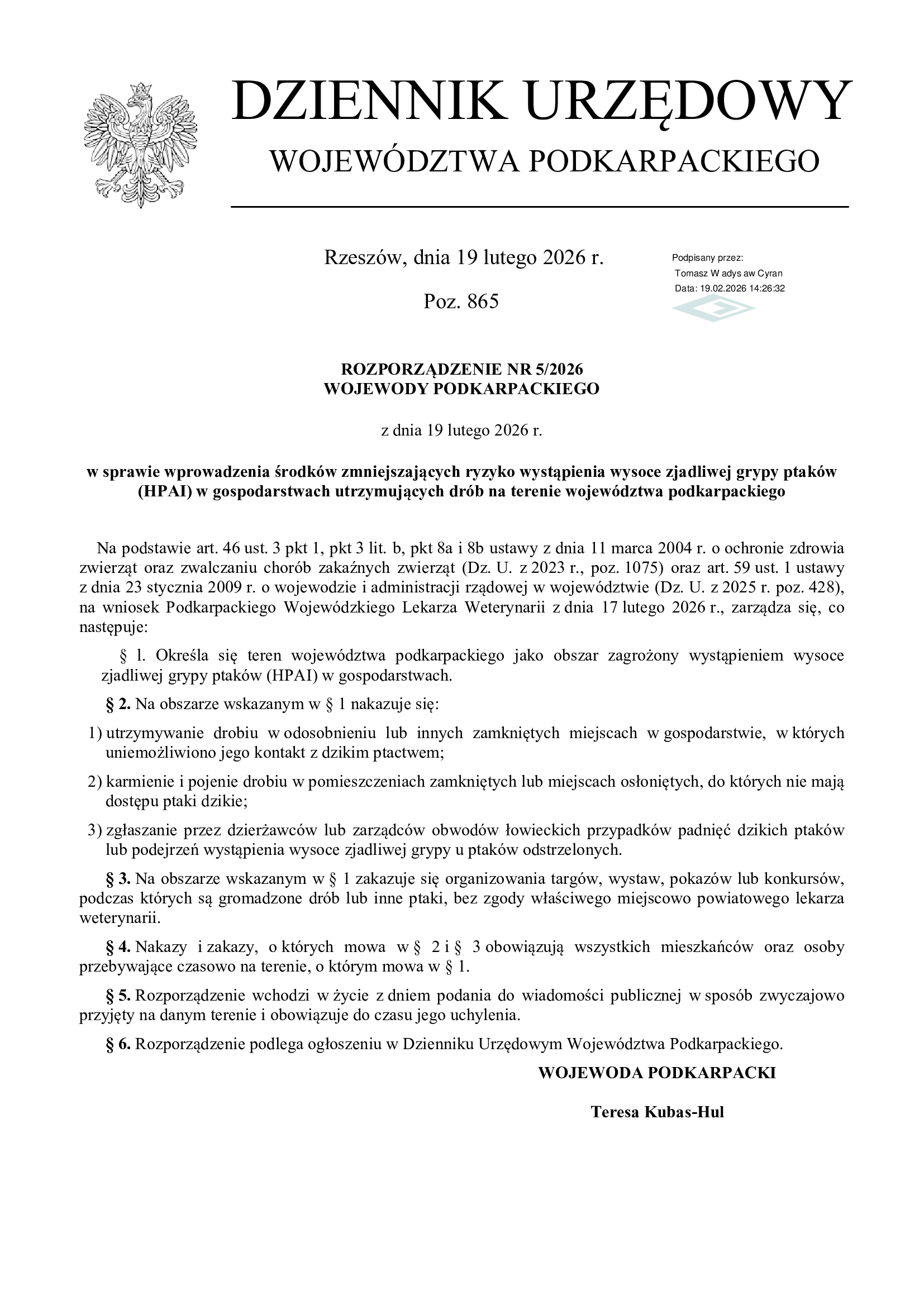 Rozporządzenie Wojewody Podkarpackiego z dnia 19 lutego 2026 r.