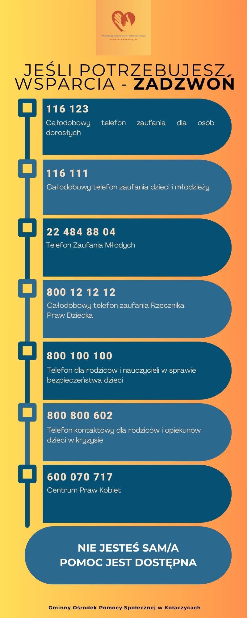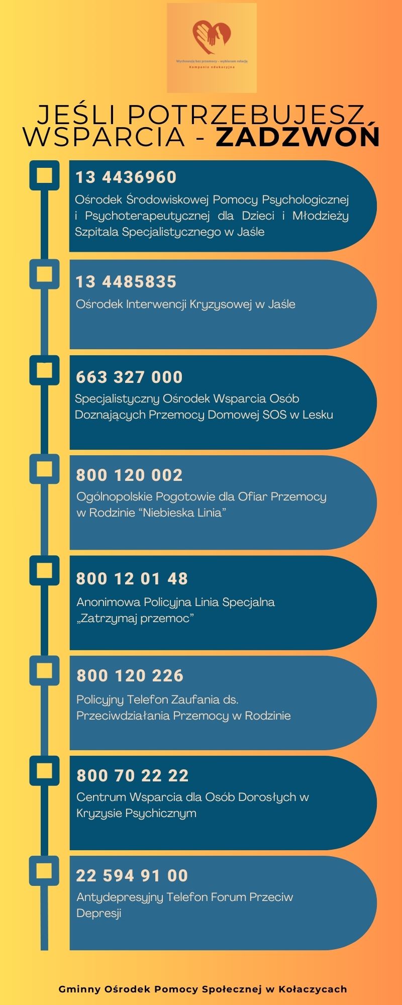 Poniżej przedstawiamy 𝐧𝐚𝐣𝐰𝐚ż𝐧𝐢𝐞𝐣𝐬𝐳𝐞 𝐧𝐮𝐦𝐞𝐫𝐲 𝐭𝐞𝐥𝐞𝐟𝐨𝐧ó𝐰 𝐰𝐬𝐩𝐚𝐫𝐜𝐢𝐚 oraz dane kontaktowe, przygotowane przez GOPS Kołaczyce.