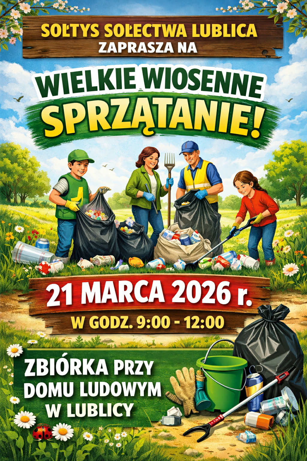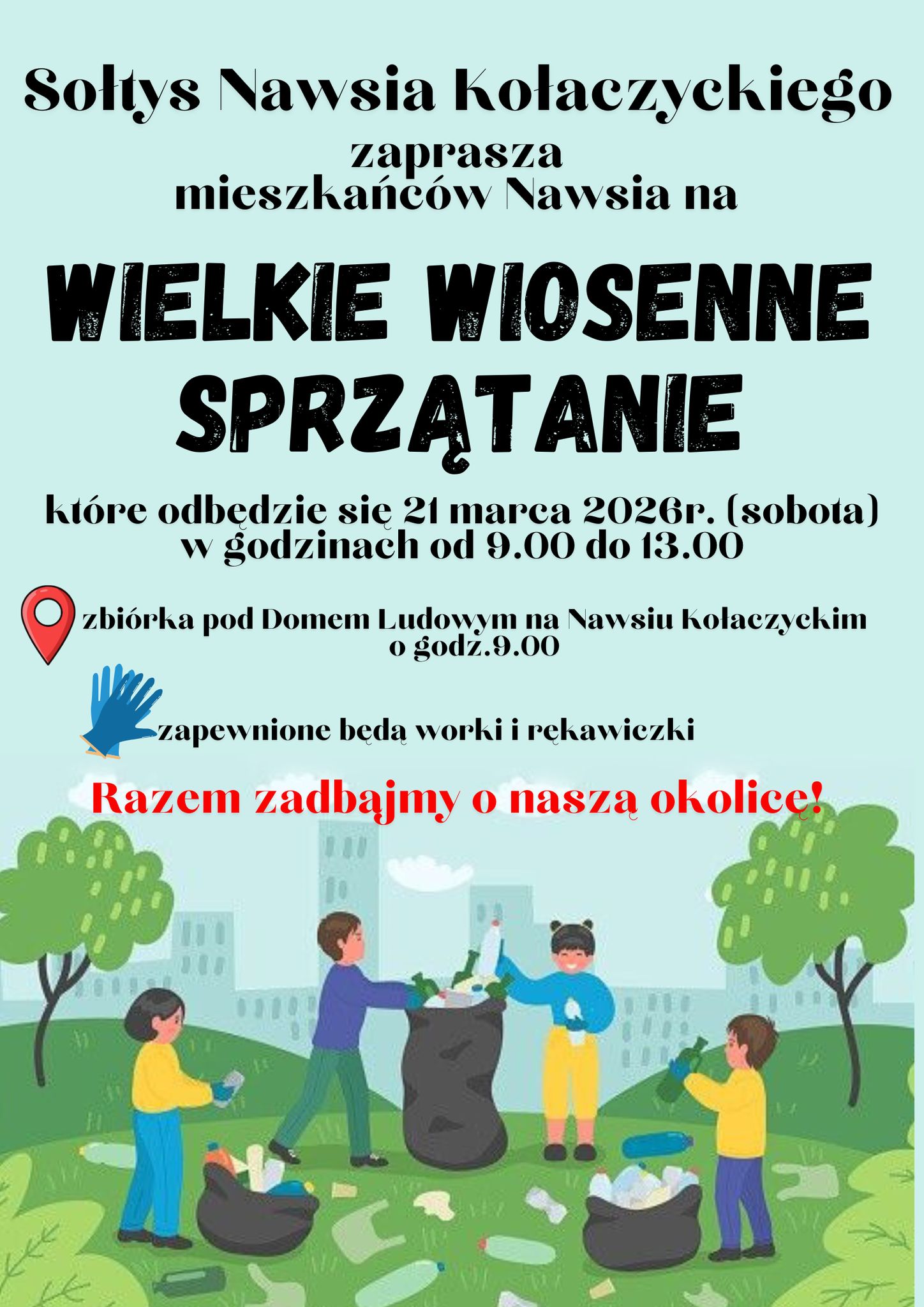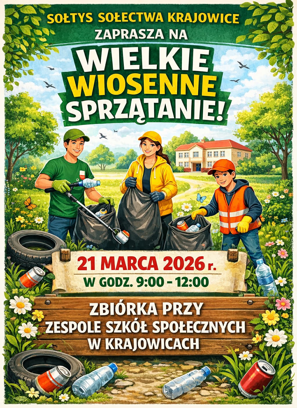 Zapraszamy wszystkich mieszkańców do udziału w wielkiej akcji sprzątania Gminy, która odbędzie się 𝟐𝟏 𝐦𝐚𝐫𝐜𝐚 𝟐𝟎𝟐𝟔 𝐫. (sobota).