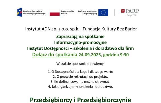 Instytut ADN sp. z o.o. sp. k. oraz Fundacja Kultury bez Barier zapraszają Przedsiębiorców do udziału w projekcie Instytut Dostępności - szkolenia i doradztwo dla firm, o numerze FERS.01.03-IP.09-002/24.