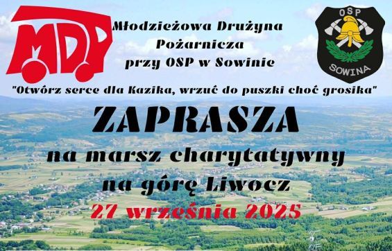 Młodzieżowa Drużyna Pożarnicza (MDP) zaprasza na wyjątkowe wydarzenie: Marsz Charytatywny na Górę Liwocz, pod hasłem: "Otwórz serce dla Kazika, wrzuć do puszki choć grosika"
