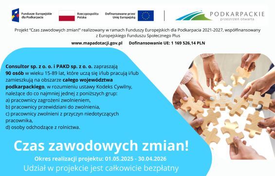 Consultor Sp. z o.o. w partnerstwie z Podkarpacką Agencją Konsultingowo Doradczą Sp. z o.o. informuje, że rozpoczęto realizację projektu „Czas zawodowych zmian!”.