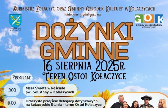 Burmistrz Kołaczyc oraz Gminny Ośrodek Kultury w Kołaczycach serdecznie zapraszają na Dożynki Gminne, które odbędą się 16 sierpnia 2025 roku na Terenie Ostoi Kołaczyce.