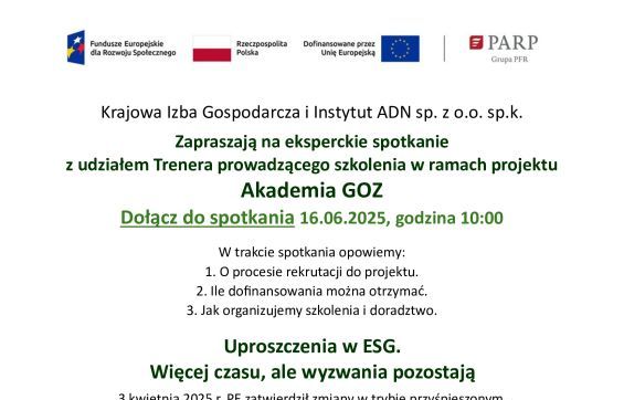 Informacje o projekcie Akademia GOZ, który jest realizowany przez Krajową Izbę Gospodarczą oraz Instytut ADN sp. z o.o., sp. k. Numer projektu: FERS.01.03-IP.09-0086/23.