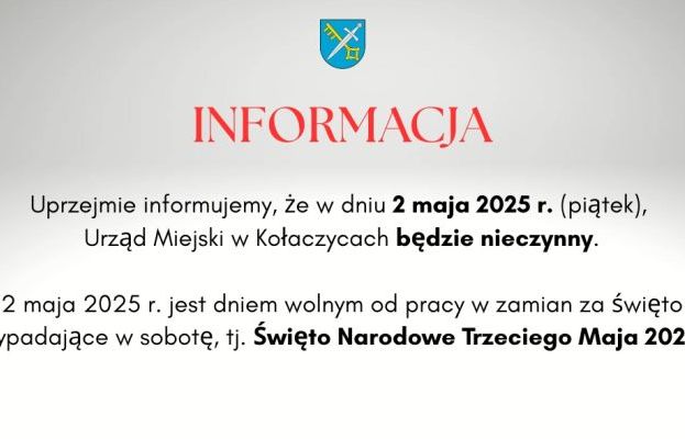 Uprzejmie informujemy, że w dniu 2 maja 2025 r. (piątek), Urząd Miejski w Kołaczycach będzie nieczynny.