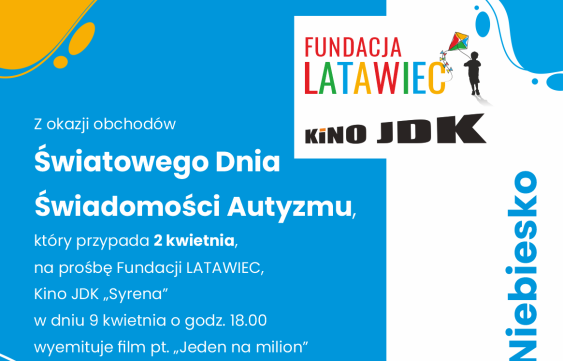 Informujemy, że z okazji Światowego Dnia Świadomości Autyzmu, w dniu 9 kwietnia 2025 r. o godz. 18:00 Kino JDK "Syrena" wyemituje film pt. "Jeden na milion"
