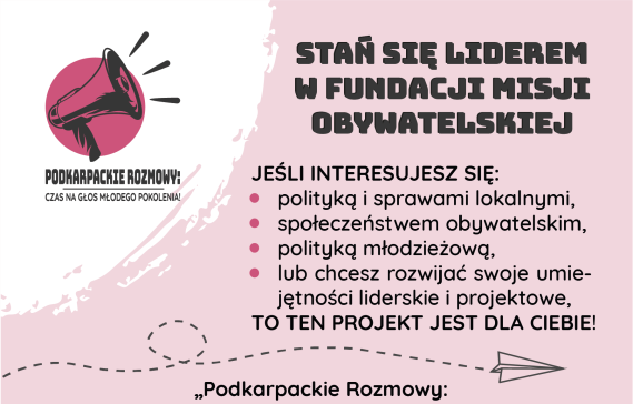 Fundacja Misji Obywatelskiej przekazuje informacje odnośnie projektu „Podkarpackie Rozmowy: Czas na Głos Młodego Pokolenia!”, finansowanego ze środków Unii Europejskiej.