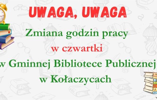 ZMIANA GODZIN PRACY W CZWARTKI W GMINNEJ BIBLIOTECE PUBLICZNEJ W KOŁACZYCACH