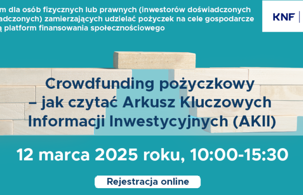 Urząd Komisji Nadzoru Finansowego organizuje 12 marca 2025 roku (10:00-15:30) webinarium dla inwestorów (doświadczonych, jak i niedoświadczonych) „Crowdfunding pożyczkowy – jak czytać Arkusz Kluczowych...