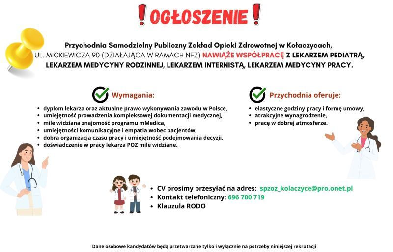 Przychodnia Samodzielny Publiczny Zakład Opieki Zdrowotnej w Kołaczycach, ul. Mickiewicza 90 (działająca w ramach NFZ) .nawiąże współpracę z lekarzem pediatrą, lekarzem medycyny rodzinnej, lekarzem internistą, lekarzem medycyny pracy...