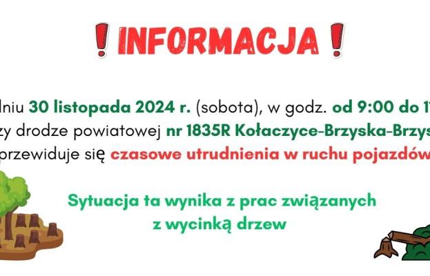 W dniu 30 listopada 2024 r. (sobota), w godz. od 9:00 - 11:00, przy drodze powiatowej nr 1835R Kołaczyce - Brzyska - Brzyska, przewiduje się czasowe utrudnienia w ruchu pojazdów.