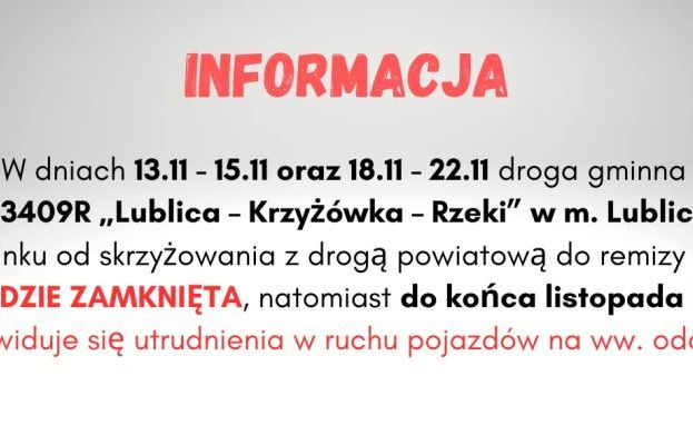 W związku z realizacją zadania pn. „Uporządkowanie oraz integracja sieci dróg gminnych w Gminie Kołaczyce poprzez ich przebudowę i modernizację”, informujemy, że w dniach 13.11.2024 r. – 15.11.2024 r. oraz 18.11.2024...