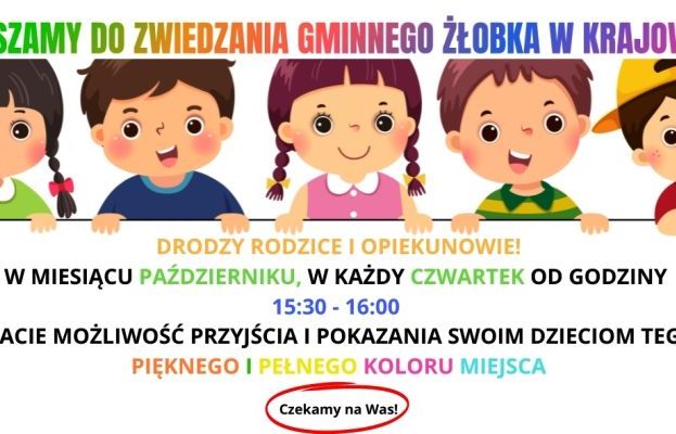 Gminny Żłobek w Krajowicach serdecznie zaprasza rodziców i dzieci na DZIEŃ OTWARTY, który odbędzie się 30.09.2024 r. (poniedziałek), w godz. 14:00 - 16:00.