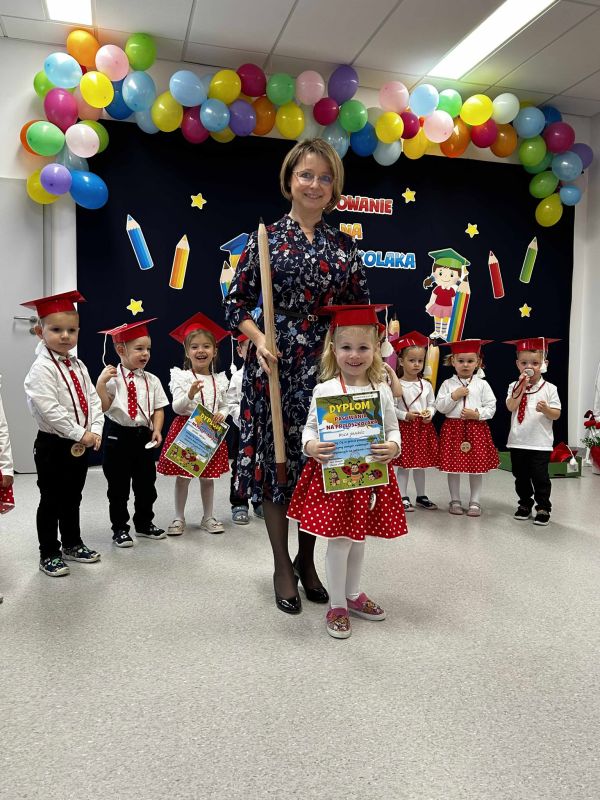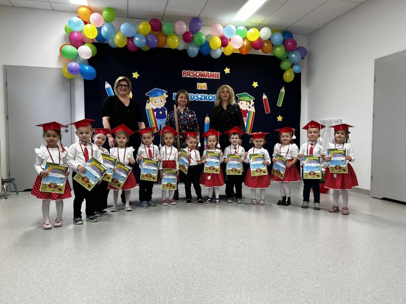 Na pamiątkę oficjalnego przyjęcia w poczet przedszkolaków dzieci otrzymały pamiątkowe dyplomy, medale, birety i słodkie upominki. Gratulujemy przedszkolakom i życzymy bogatego w doświadczenia pobytu w naszym przedszkolu.