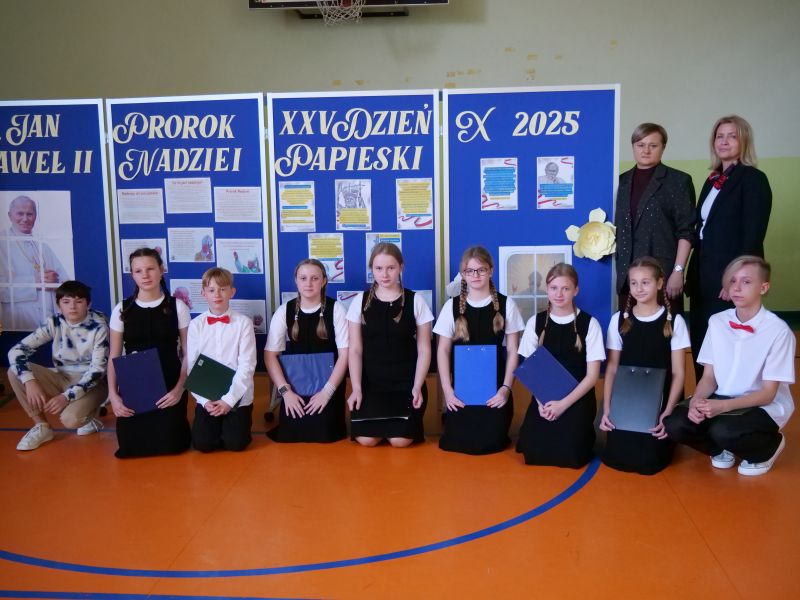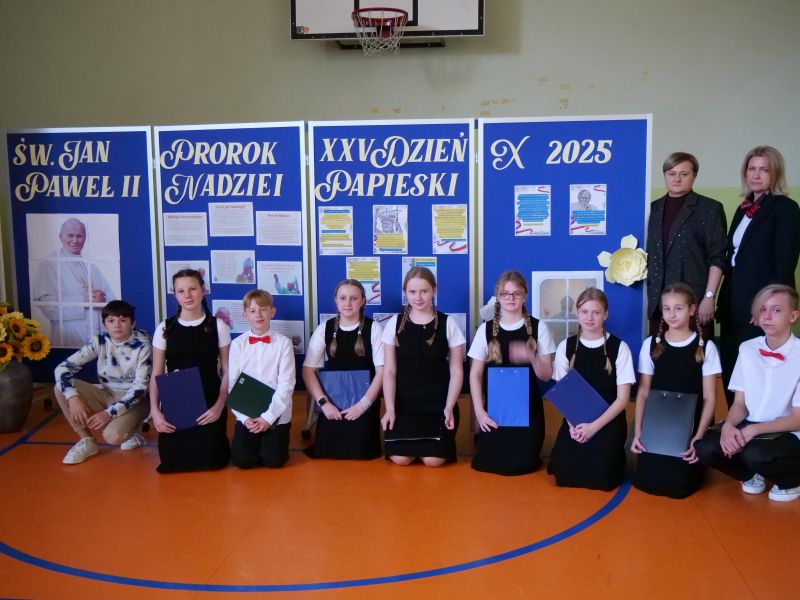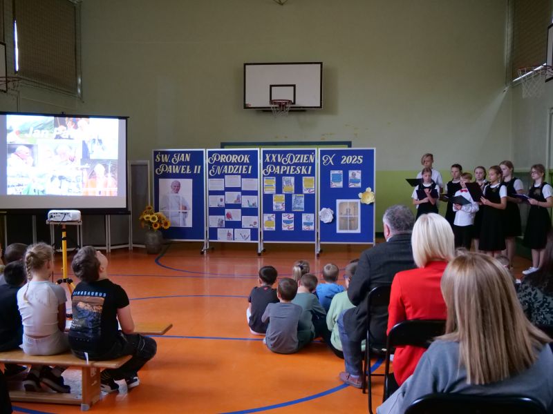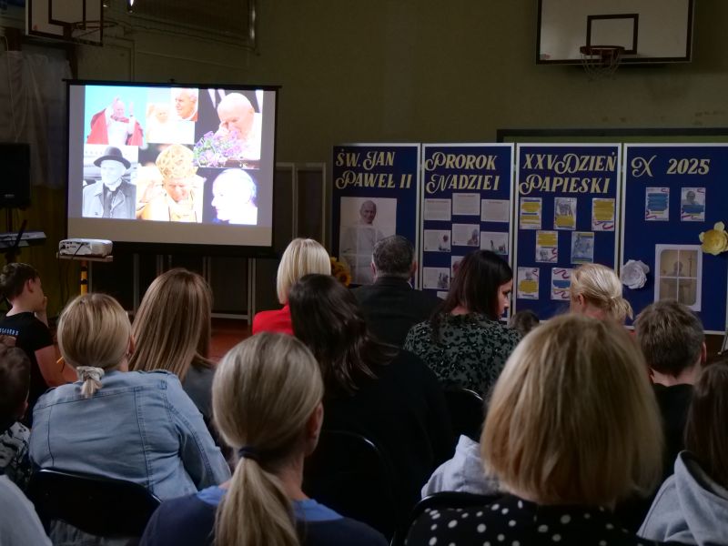 17 października br. z okazji XXV Dnia Papieskiego w naszej szkole odbyła się akademia poświęcona pamięci naszego wielkiego rodaka Jana Pawła II. Członkowie Szkolnego Koła Caritas pod opieką Pani Wicedyrektor Beaty Biernackiej oraz Pani Elżbiety Tutaj przygotowali montaż słowno - muzyczny, w którym przypomnieli najważniejsze daty i wydarzenia z życia Karola Wojdyły oraz cytaty z jego homilii stanowiące drogowskazy życiowe dla każdego katolika. Następnie uczniowie przy akompaniamencie Pana Dyrektora Wiesława Jedziniaka odśpiewali znaną wszystkim pieśń "Barka".