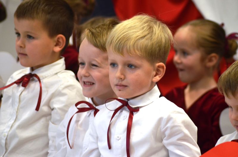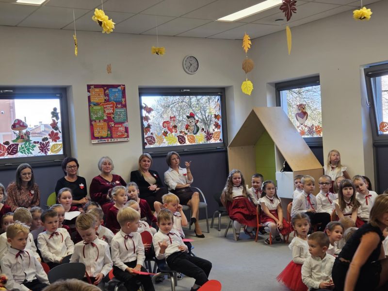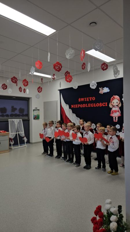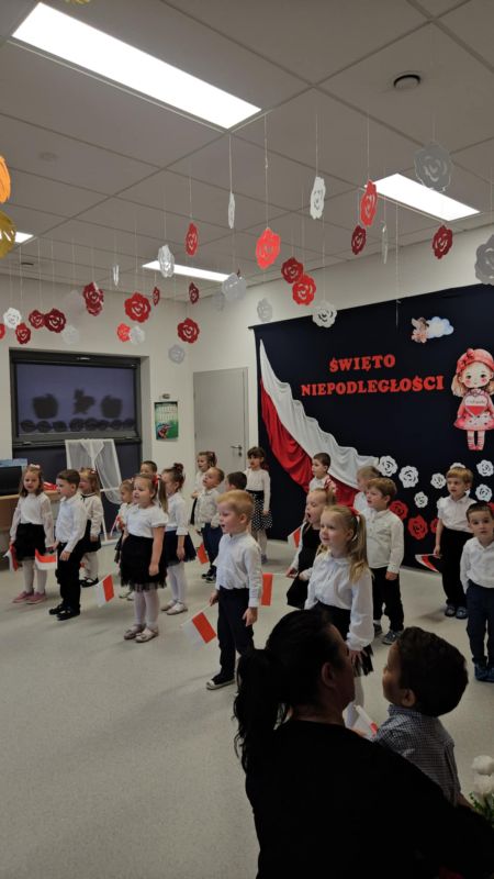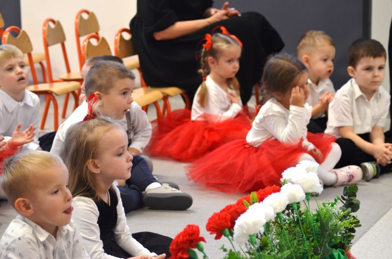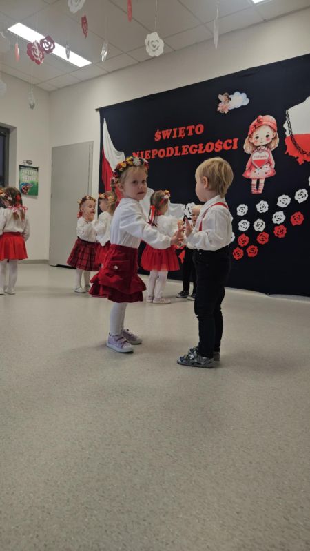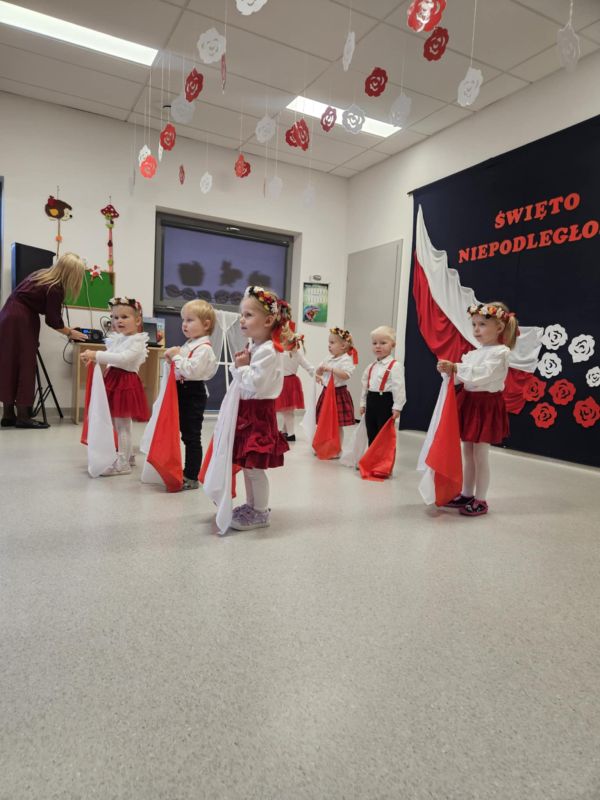 Maluchy, pod czujnym okiem i z pomocą Pań Nauczycielek, przygotowały przepiękny program artystyczny. Przedszkolaki z ogromnym zaangażowaniem śpiewały patriotyczne piosenki, oraz tańczyły – ich występy były nie tylko urocze, ale i niezwykle wzruszające, pokazując, że już najmłodsi potrafią celebrować ten ważny dzień. Było to naprawdę piękne i bardzo udane wydarzenie.